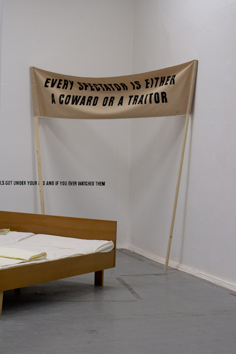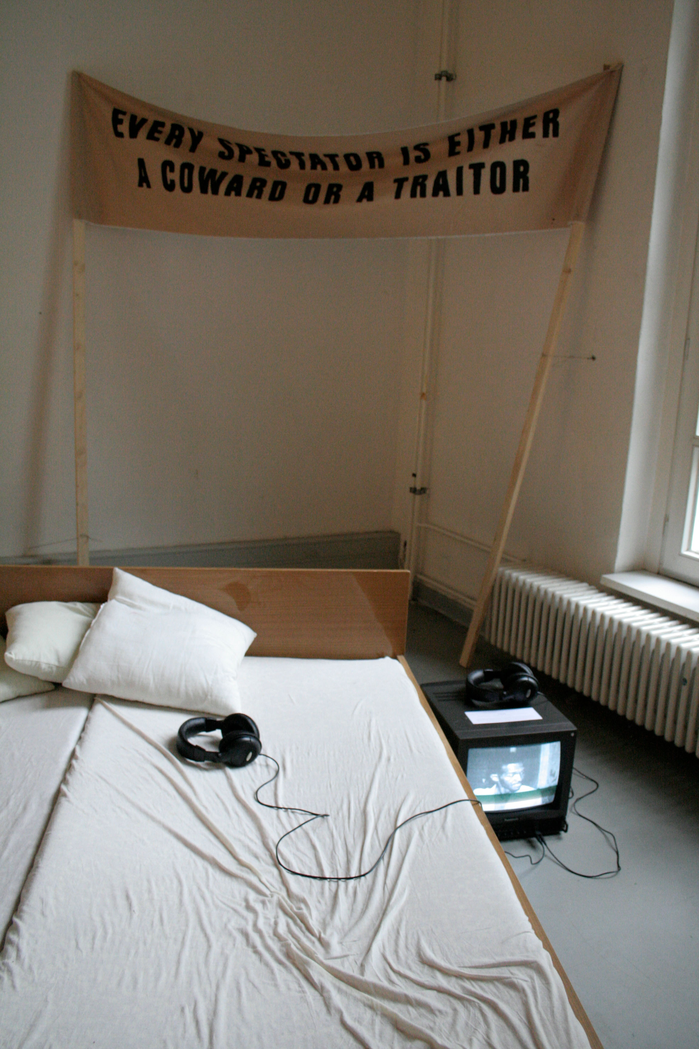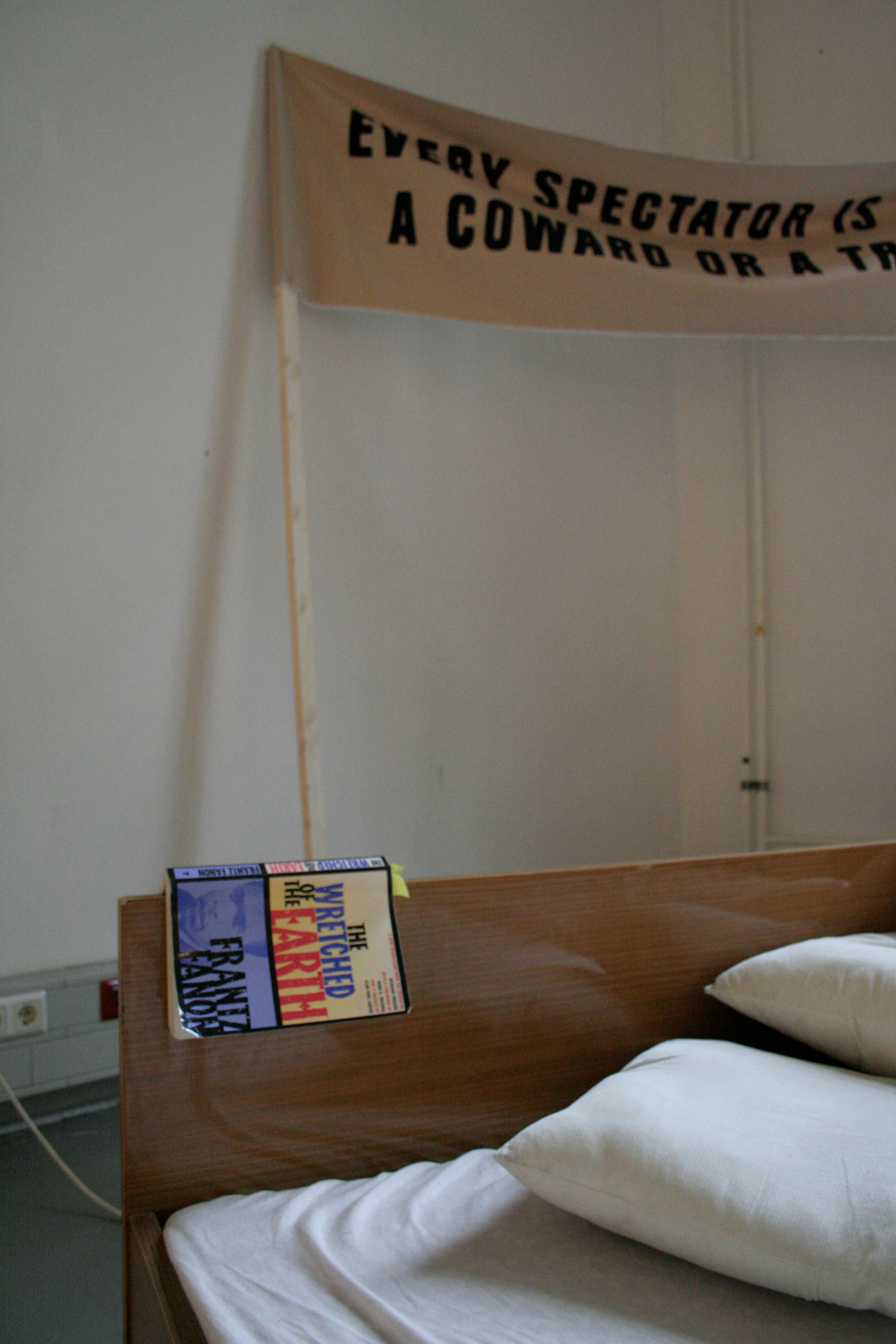 The installation invites visitors to lie in a replica of Dutschke’s bed (Vereinigte Möbelwerke Magdeburg, model “Angela”) and speculate about what else might have been hidden beneath it. Above the bed hangs a banner used in screenings of La hora de los hornos (1968) reading: “Every spectator is either a coward or a traitor." – an excerpts from Frantz Fanon’s The Wretched of the Earth, which can be browsed in the bed, while a research board traces connections between archival fragments, political cinema, and the mythologies that form around them. Cinema becomes a space of collective encounter, where the reality of the screen meets the reality of its audience.