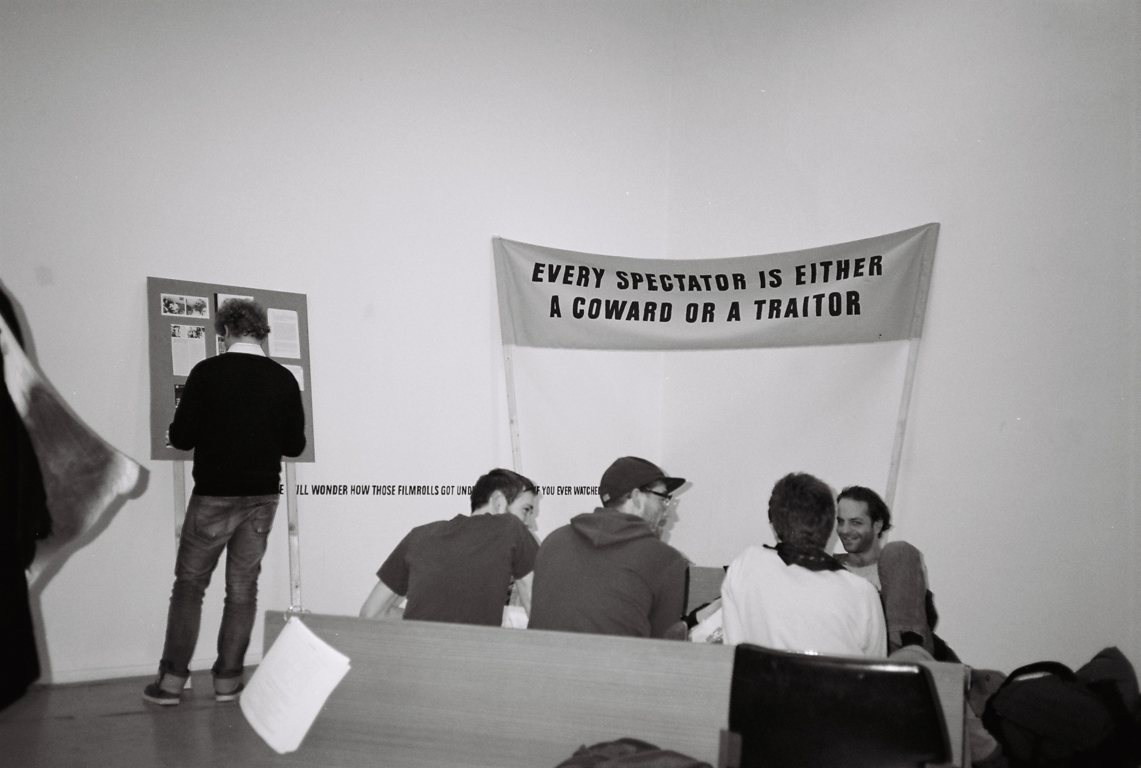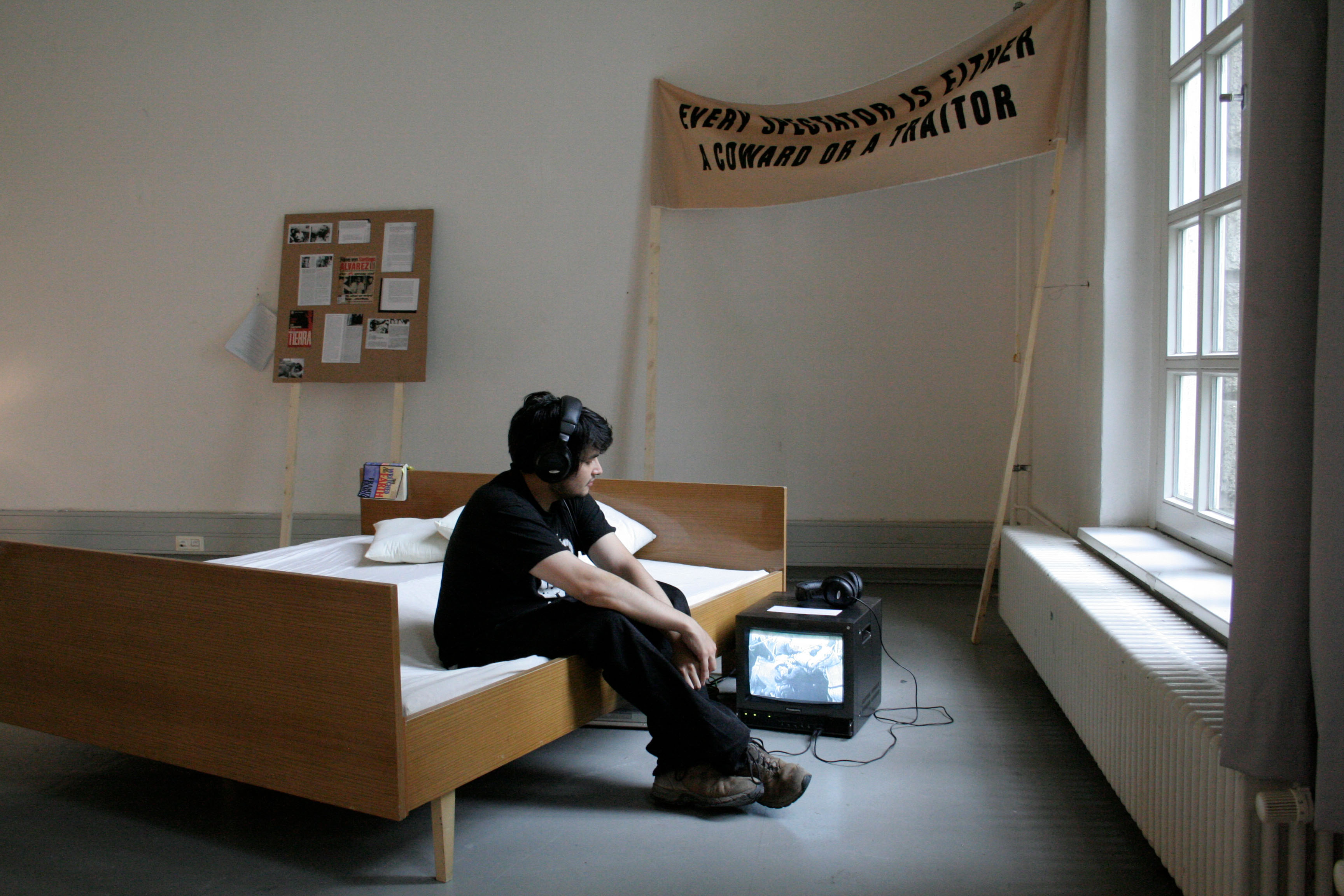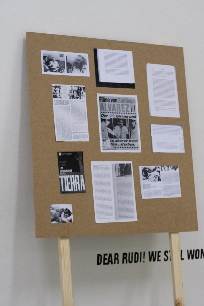 The installation invites visitors to lie in a replica of Dutschke’s bed (Vereinigte Möbelwerke Magdeburg, model “Angela”) and speculate about what else might have been hidden beneath it. Above the bed hangs a banner used in screenings of La hora de los hornos (1968) reading: “Every spectator is either a coward or a traitor." – an excerpts from Frantz Fanon’s The Wretched of the Earth, which can be browsed in the bed, while a research board traces connections between archival fragments, political cinema, and the mythologies that form around them. Cinema becomes a space of collective encounter, where the reality of the screen meets the reality of its audience.