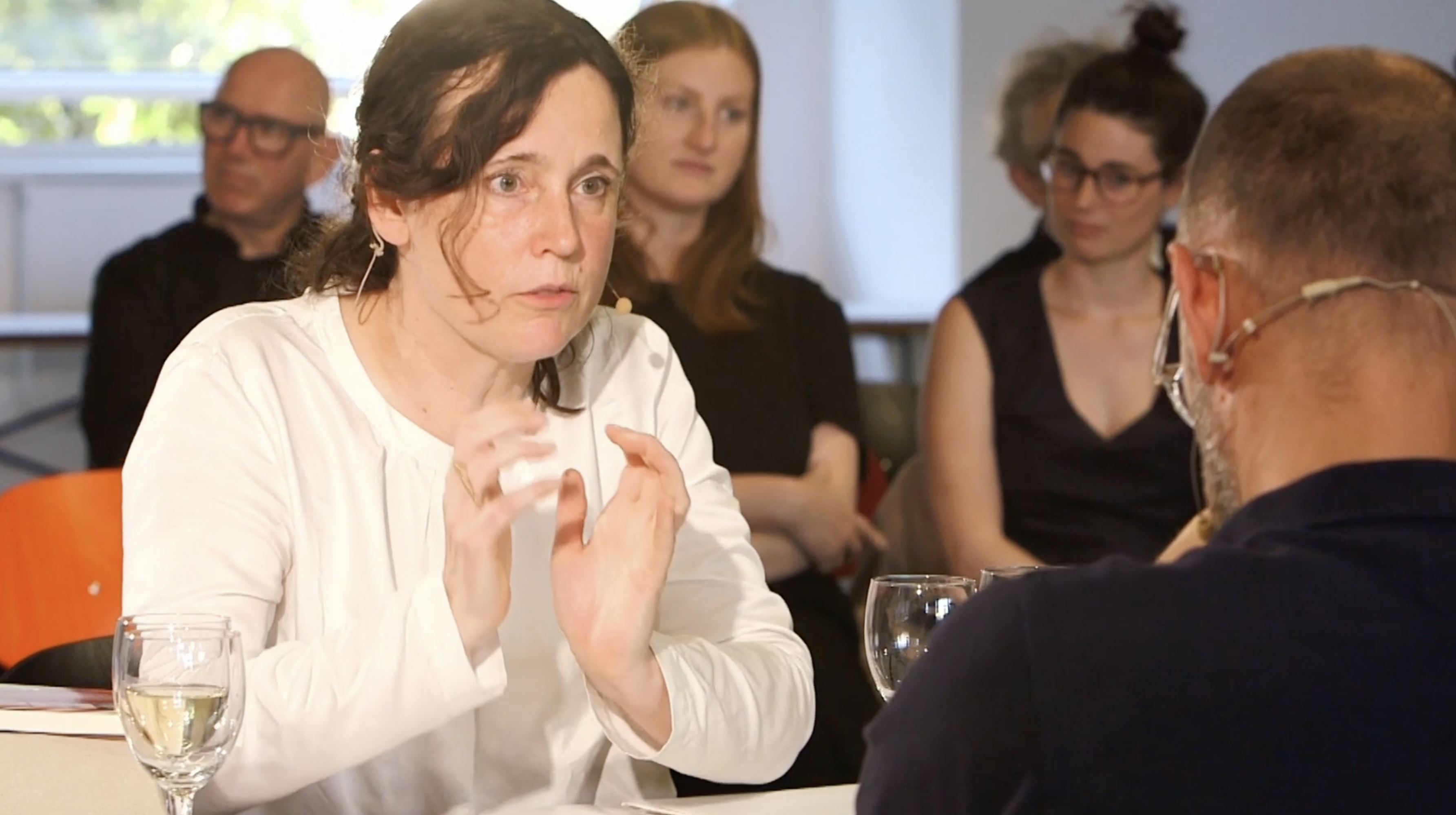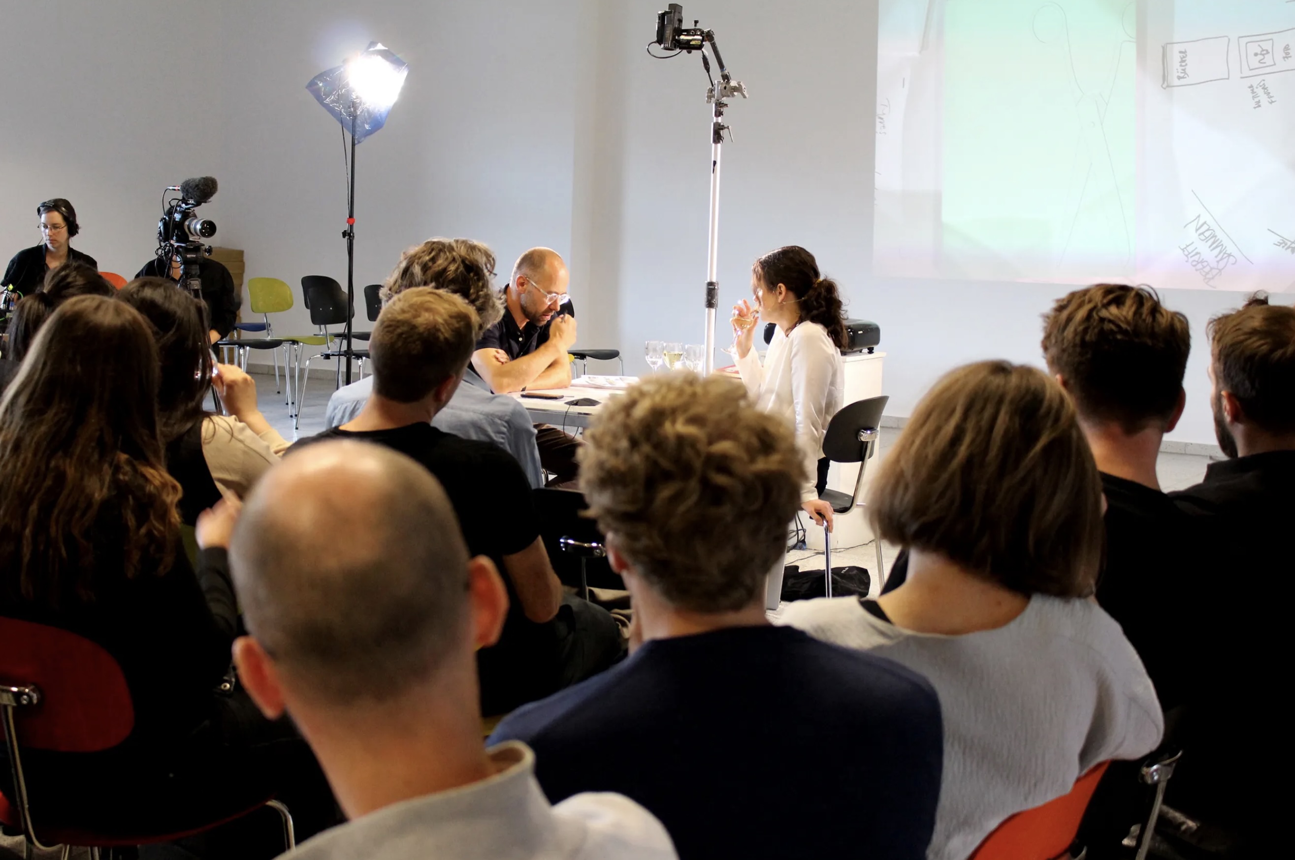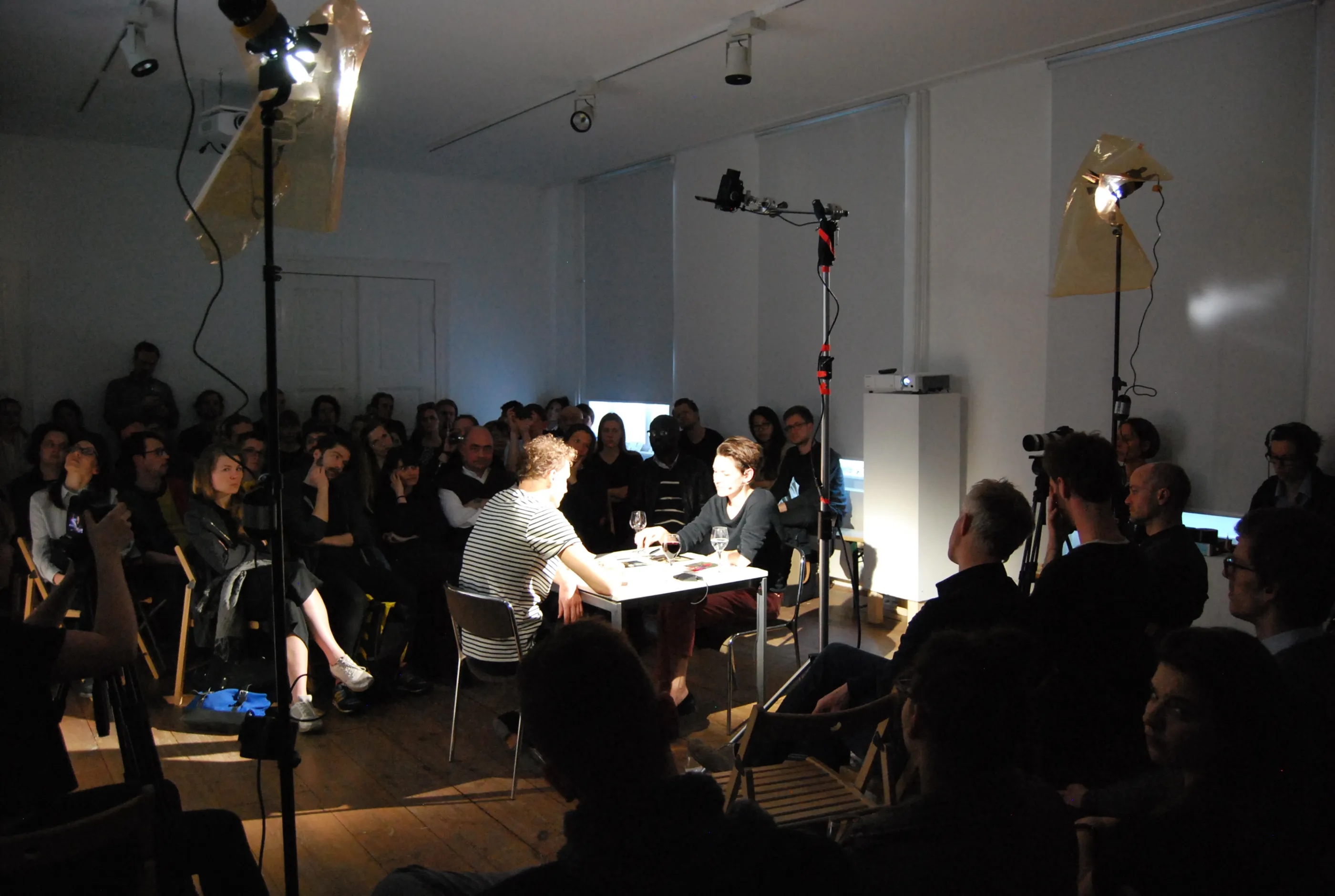 Our aim in developing the video and set design was to move beyond a conventional documentation of a talk. By positioning the speakers face to face and arranging the audience around them, we created a spatial tension that functioned both as a film set and as a live situation. The lighting design established an intimate atmosphere for the conversation while enabling a high-quality recording.