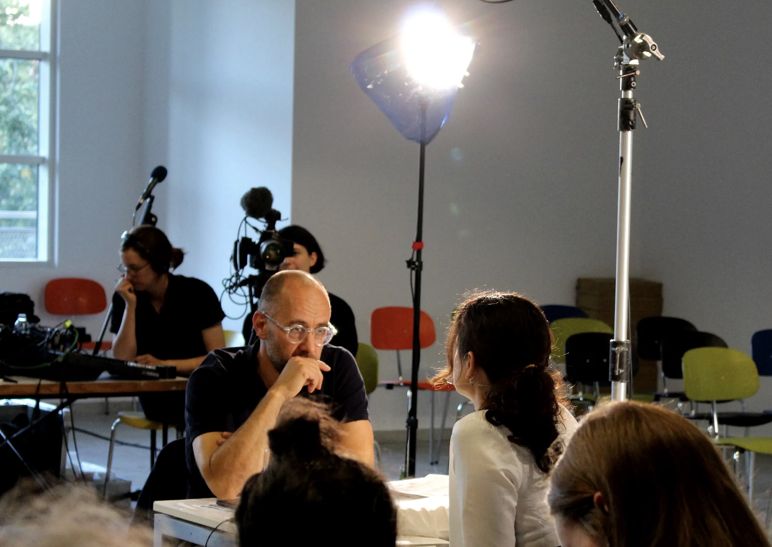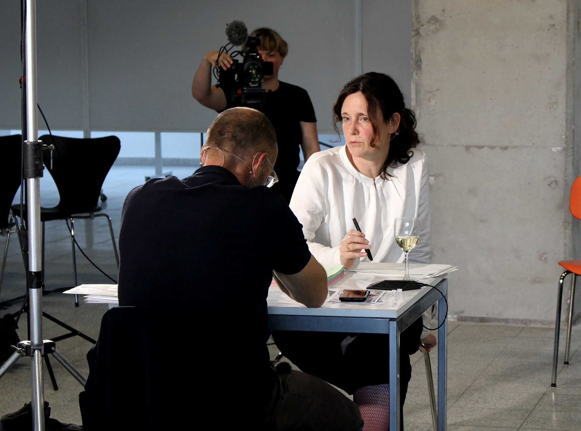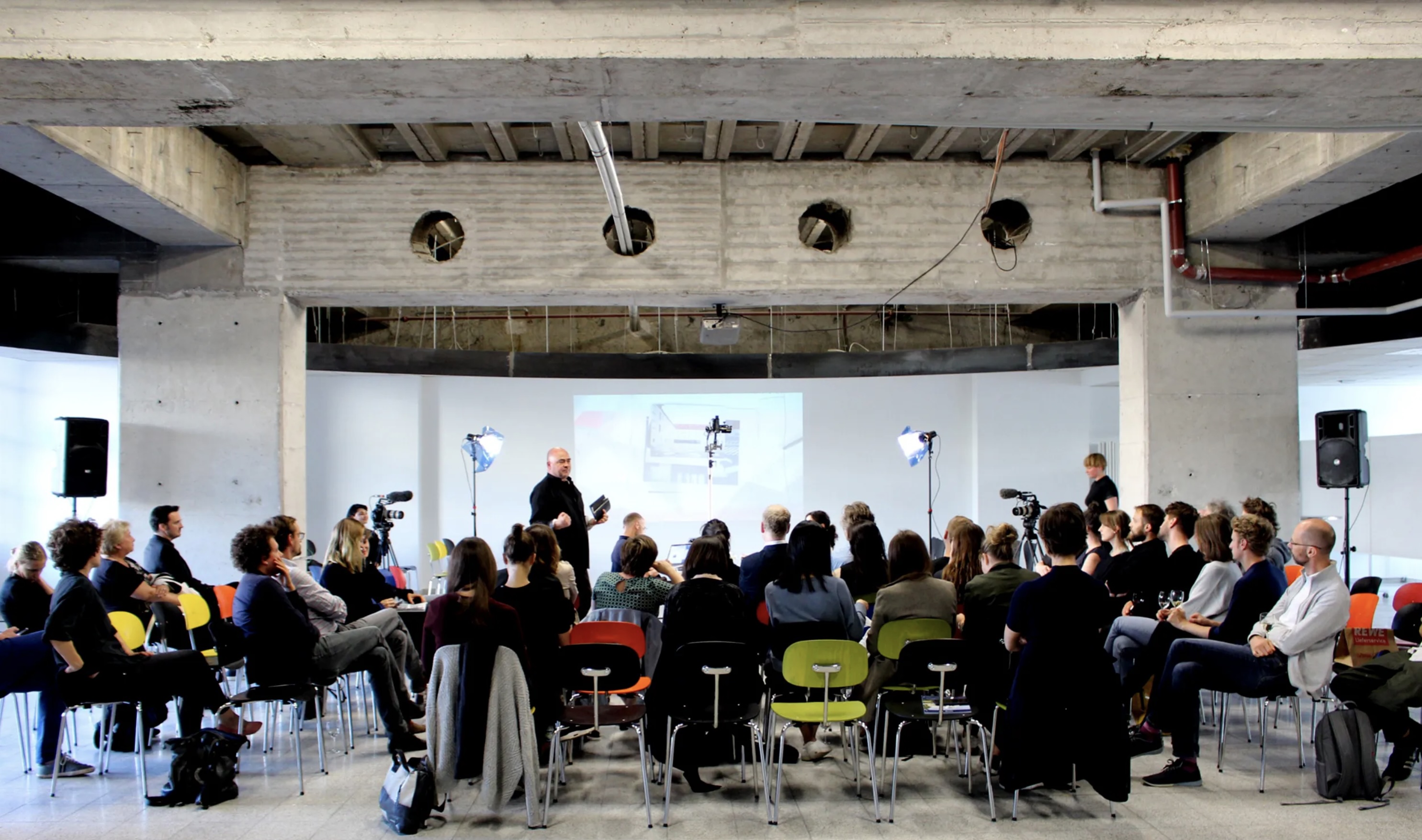 Our aim in developing the video and set design was to move beyond a conventional documentation of a talk. By positioning the speakers face to face and arranging the audience around them, we created a spatial tension that functioned both as a film set and as a live situation. The lighting design established an intimate atmosphere for the conversation while enabling a high-quality recording.