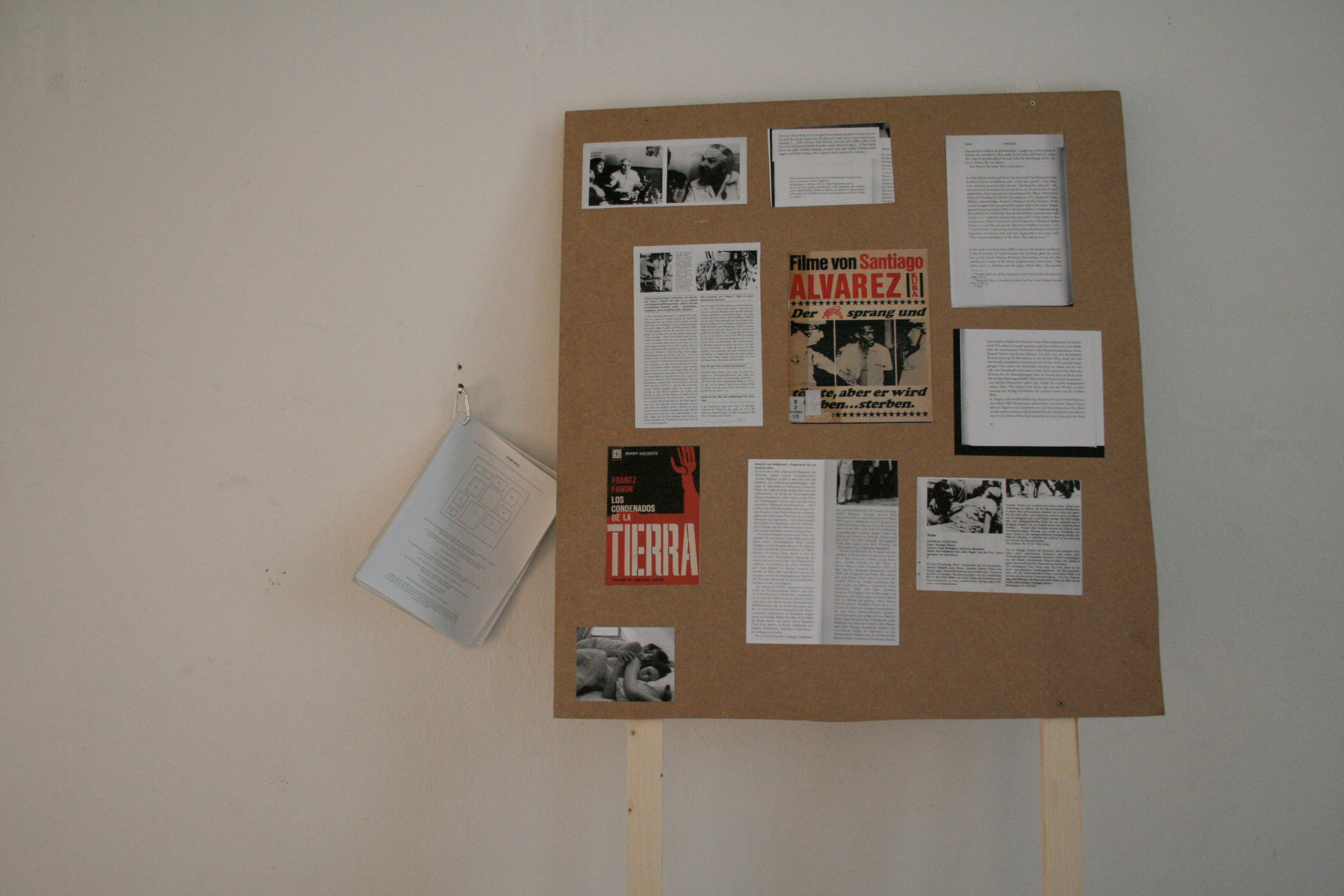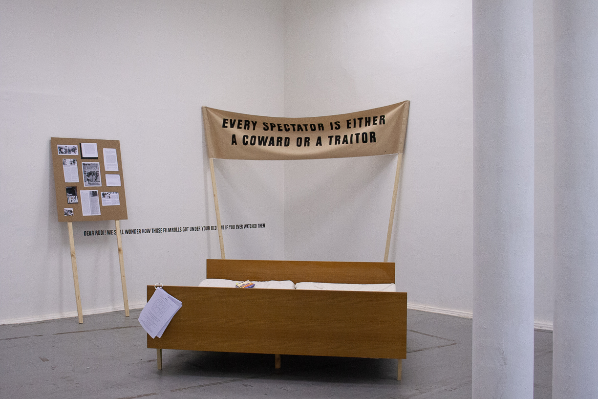 The installation invites visitors to lie in a replica of Dutschke’s bed (Vereinigte Möbelwerke Magdeburg, model “Angela”) and speculate about what else might have been hidden beneath it. Above the bed hangs a banner used in screenings of La hora de los hornos (1968) reading: “Every spectator is either a coward or a traitor." – an excerpts from Frantz Fanon’s The Wretched of the Earth, which can be browsed in the bed, while a research board traces connections between archival fragments, political cinema, and the mythologies that form around them. Cinema becomes a space of collective encounter, where the reality of the screen meets the reality of its audience.