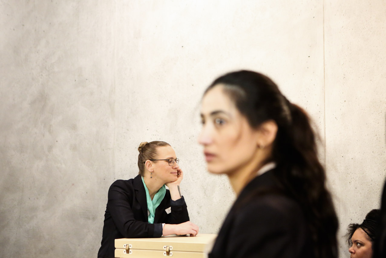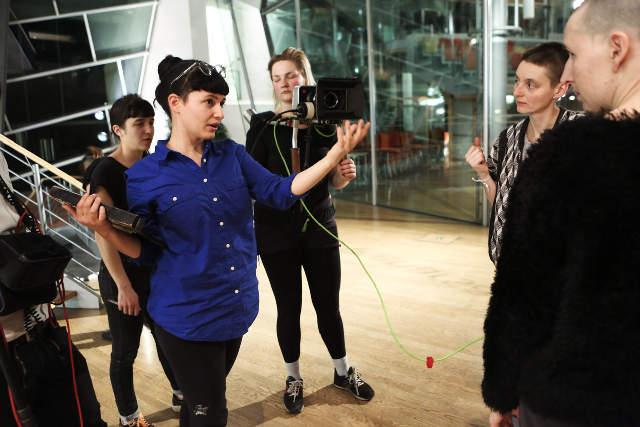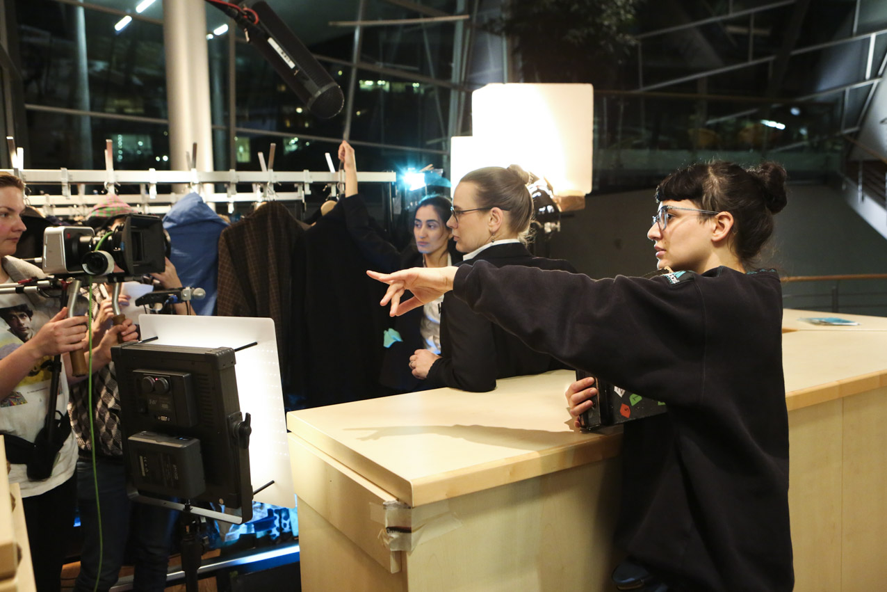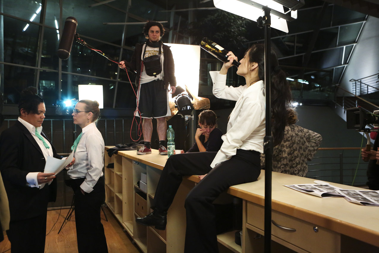 Our aim was to make a fiction with strong, complex female characters that deals with the relationship between the possibilities and limits of reproduction, both technologically and socio-politically. We wanted to look at the current relevance of a classic call to arms by Marxist feminist theorist Silvia Federici, “Wages Against Housework” (1975), by relocating its demands in today’s landscape of fast-paced technological change and increasing precarity. While the film takes place in Germany, it treads on international ground because of its negotiation of motherhood and feminized labor in times of neoliberal uncertainty. Nichts ist erledigt / Not Yet Over is thus not a film for or against motherhood, but rather an essay on the conditions of reproduction today. We developed the script around the antagonism between Maria, who wants to have a child, and Ewa, who doesn’t. The younger figure of Selma serves as a joker, mediator, and instigator, galvanizing the conflict between the two women. In the end, they find a collective voice together in the coat room to counter that of our conference speaker and the kind of corporate liberal feminism she represents onstage. While she preaches the cult of “having it all” to a crowd of enraptured elites, she overlooks at whose expense that ‘all’ comes. On the contrary, as our film title proclaims, we think that there is still a lot to be done.