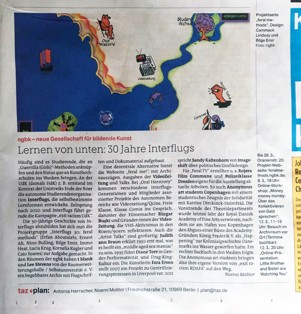 Interflugs 30: feral methods: online exhibition, research installation, and study program at nGbK Berlin, organized by the working group Erfan Aboutalebi, Ernest Ah, Nino Bulling, Bilge Emir, Immo Heat, Lucia Krug, Kornelia Kugler und Caio Soares.