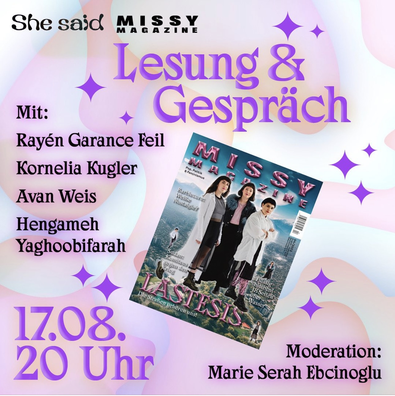 Reading and talk for Missy Magazine with editors Hengameh Yaghoobifarah, Rayén Feil and Serah Ebcinoglu and authors Alan Weiß and Kornelia Kugler.