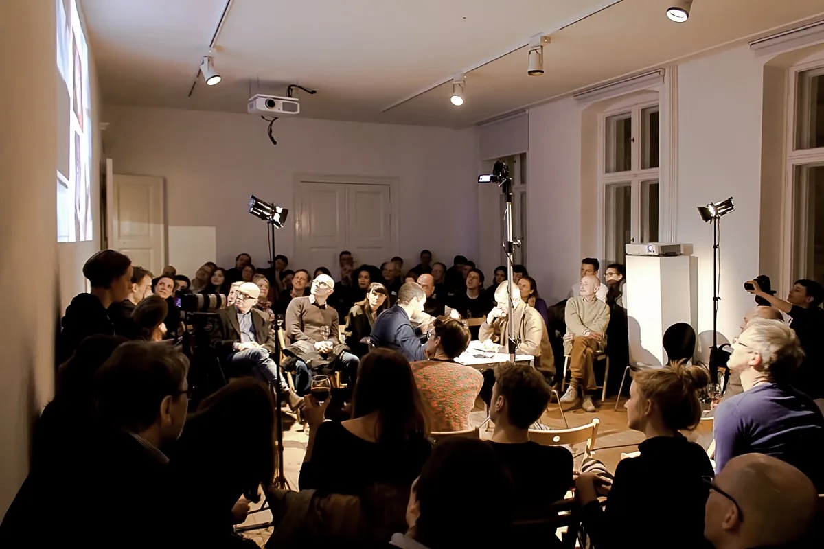 Our aim in developing the video and set design was to move beyond a conventional documentation of a talk. By positioning the speakers face to face and arranging the audience around them, we created a spatial tension that functioned both as a film set and as a live situation. The lighting design established an intimate atmosphere for the conversation while enabling a high-quality recording.